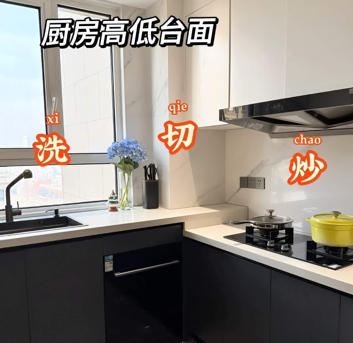 然而厨房台面保持同一平整度并不合理,使用时会发现清洁餐具、厨具需费力伸手,炒菜还得抬手,总之各种不便。