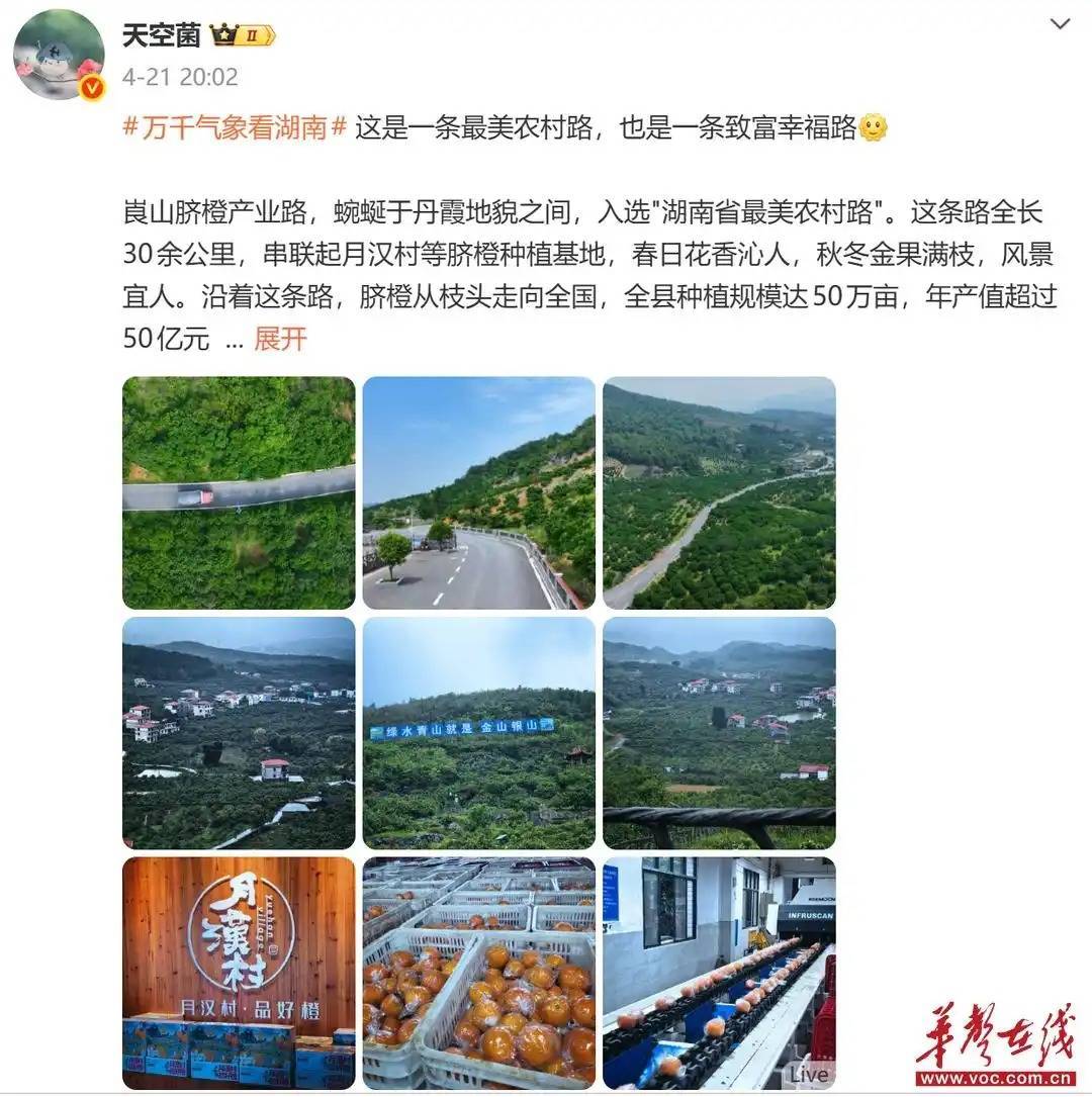 网络名人@杨孝文 激动地在橙道打卡:“生态保护与产业发展并非对立,而是可以相互成就的共生体。如今,这条‘醉美橙道’不仅是新宁的金色名片,更是乡村振兴路上的典范样本。”